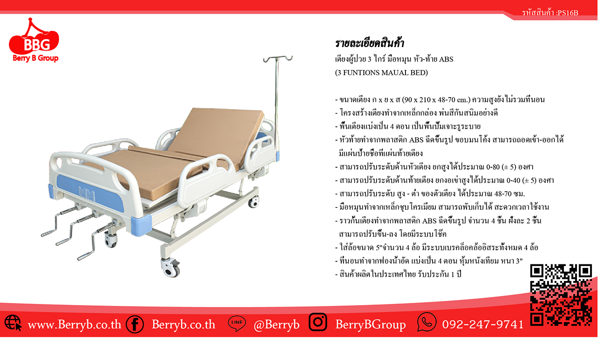 Be the first to review “เตียงผู้ป่วย 3 ไกร์ มือหมุน ราวปีกนกสั้น หัว-ท้าย ABS (3 FUNTIONS MAUAL BED)(PS16-B)”