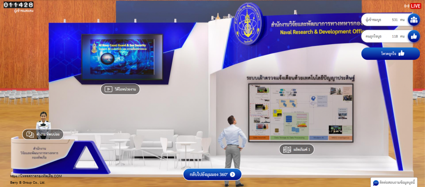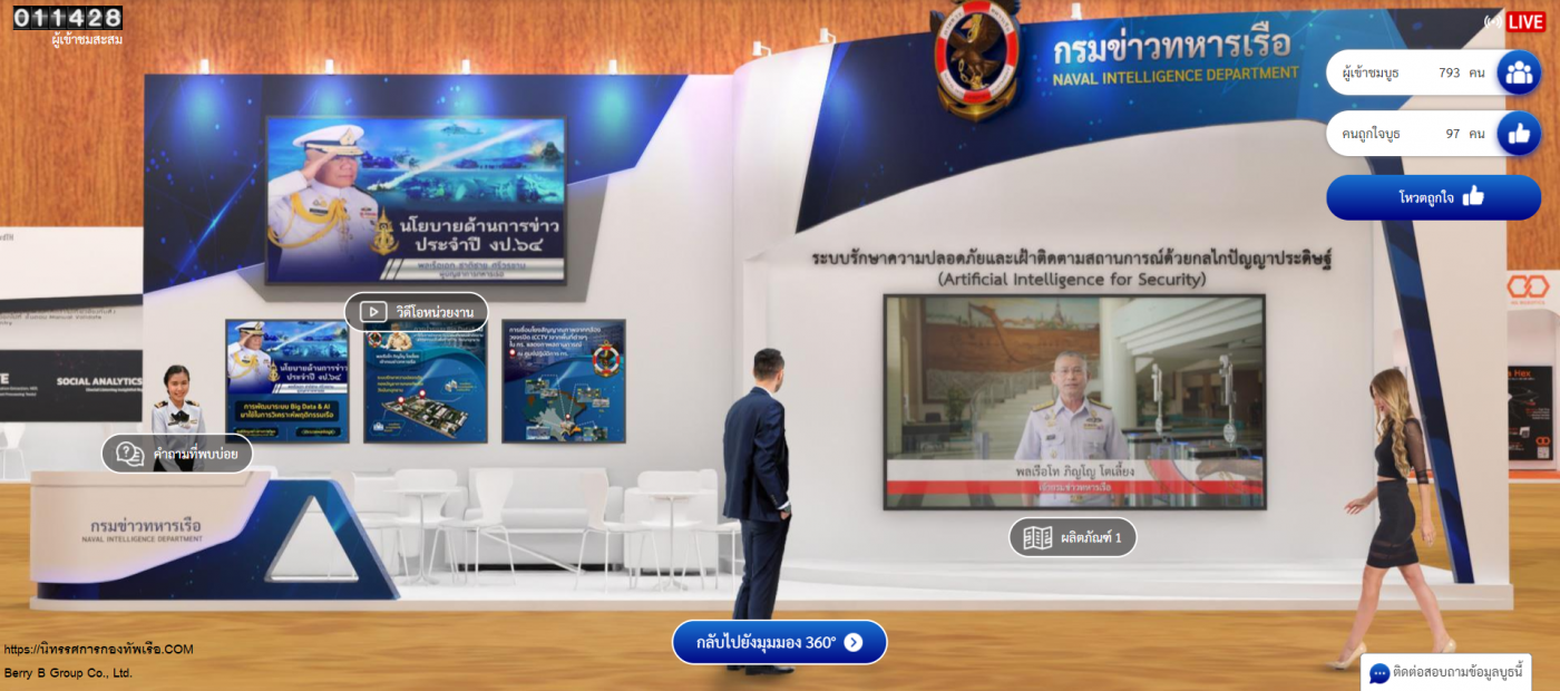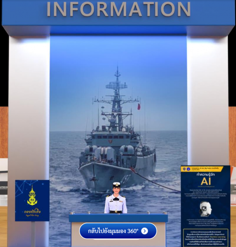 ทั้งนี้ทางเราก็ได้จัดงานนิทรรศการ AI และ Big Data กองทัพเรือ ประจำปี 2564 โดยผู้ร่วมงานสามารถชมบรรยากาศได้รอบทิศทางแบบ 360 องศา หรือ Virtual Exhibition 360° Platform ซึ่งในจุดที่มีการออกบูทหรือจัดกิจกรรมย่อยผู้เข้าร่วมงานสามารถเข้าไปร่วมกิจกรรมหรือดูข้อมูล เพื่อตอบโจทย์การจัดงานในรูปแบบ Online Event สำหรับในสถานการณ์ปัจจุบันที่ยังงดการจัดกิจกรรม แต่กิจกรรมออนไลน์สามารถเข้าร่วมได้โดยไม่จำกัดจำนวนคน สถานที่หรืออุปกรณ์ที่ใช้เข้าร่วมงาน